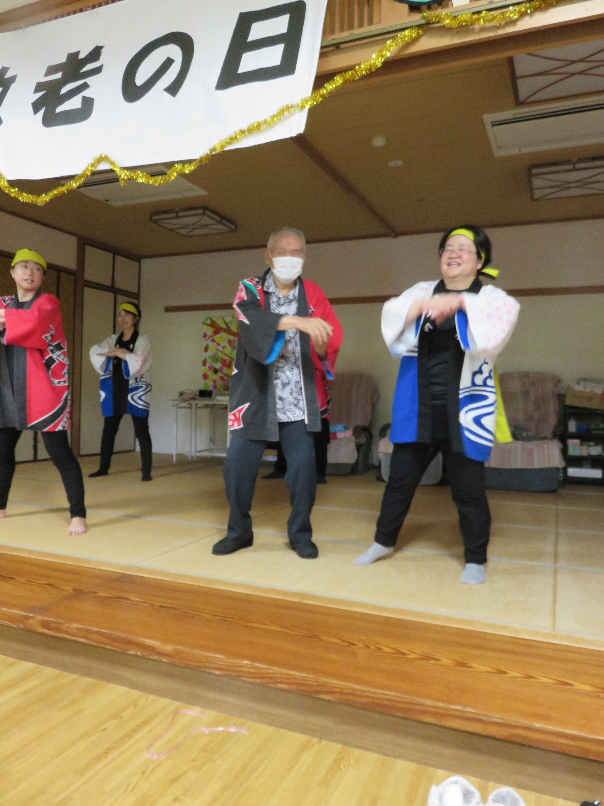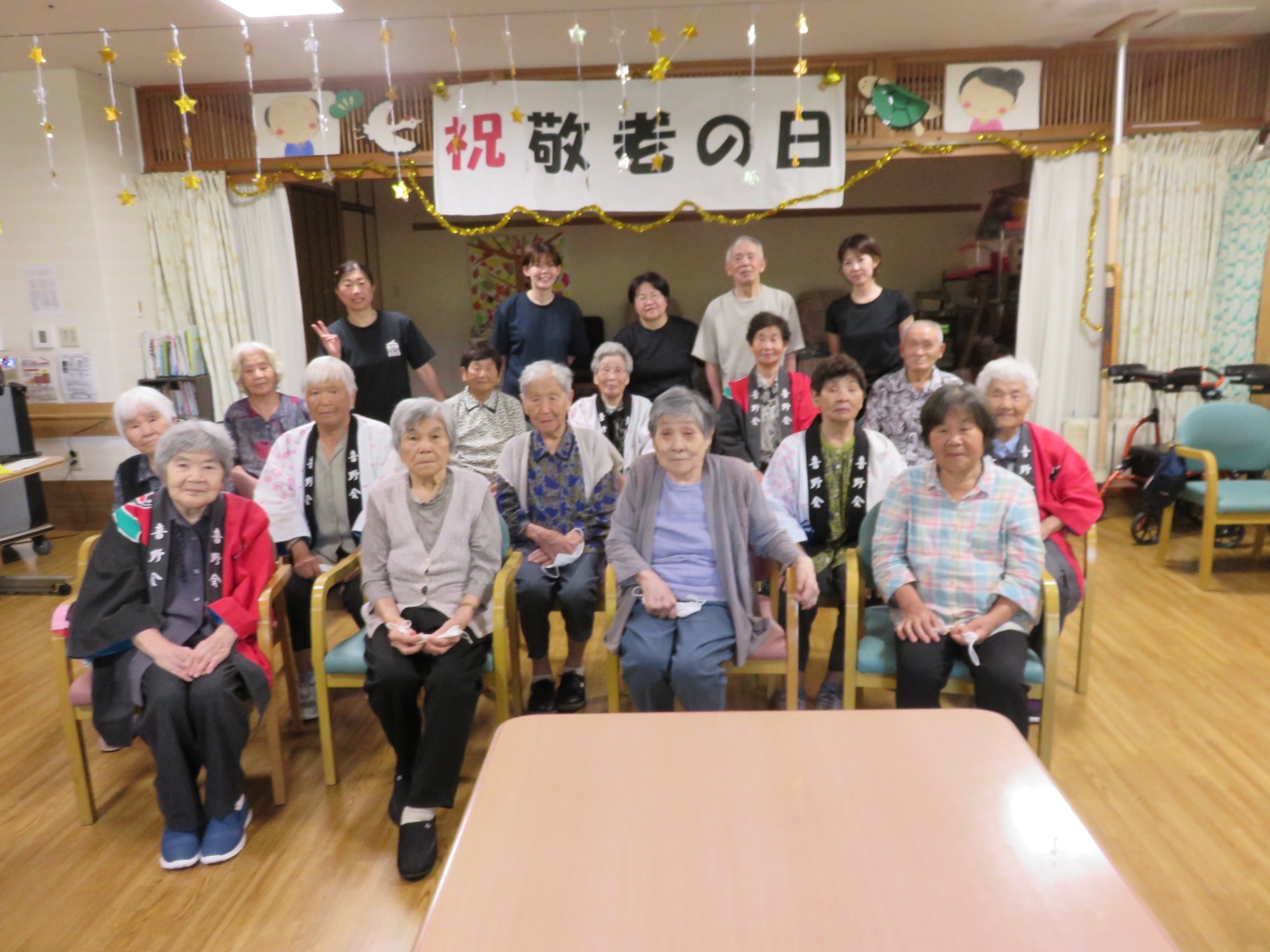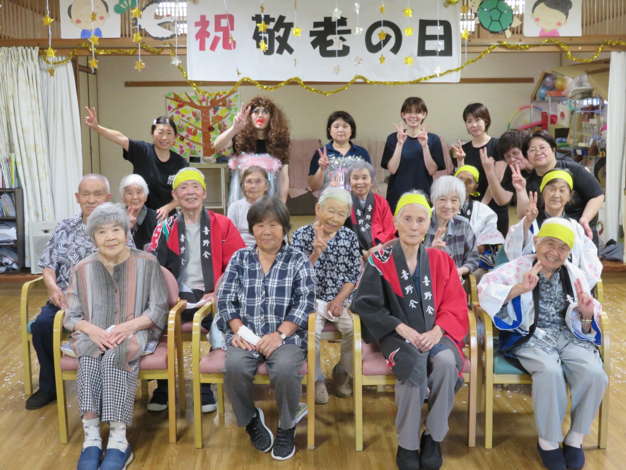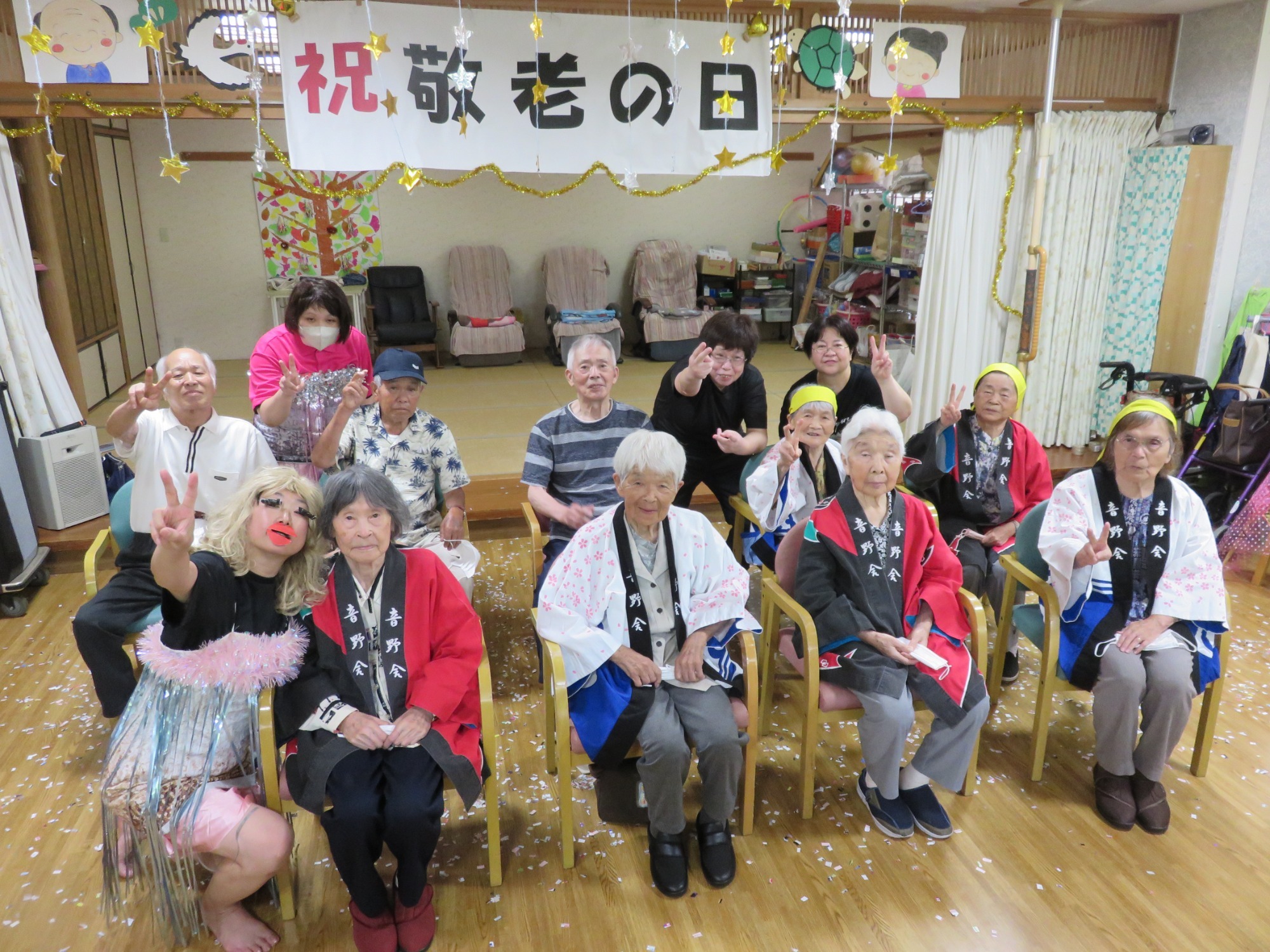 9月第3週に敬老会を行いました。 職員の余興や利用者様の飛び入り余興などもあり大笑いでした。利用者様のカラオケや踊りのうまさに大きな拍手!!役者に紙吹雪を投げて久し振りに黄色い歓声をあげていたようです。また利用者様の堂々たる姿に次回の敬老会余興の予約をお願いしました。快く引き受けてくださった方々に感謝しかありません。ありがとうございました😘💕みんなで記念撮影し、とてもいい表情です👍ささやかですが、職員で作ったプレゼントをお渡ししましたが喜んでいただけましたでしょうか?最後に、利用者様みなさま、これからもお元気でお過ごしください。(職員一同)