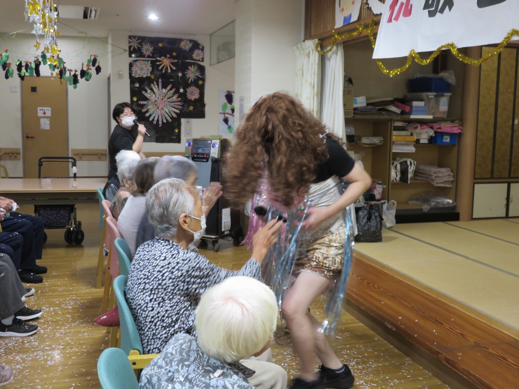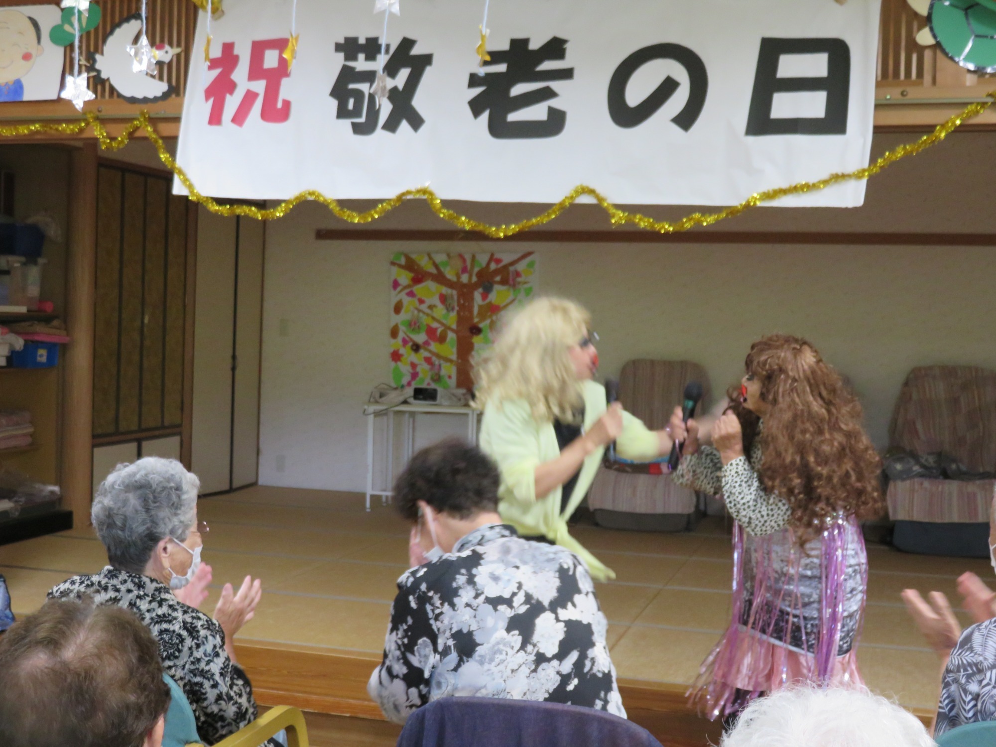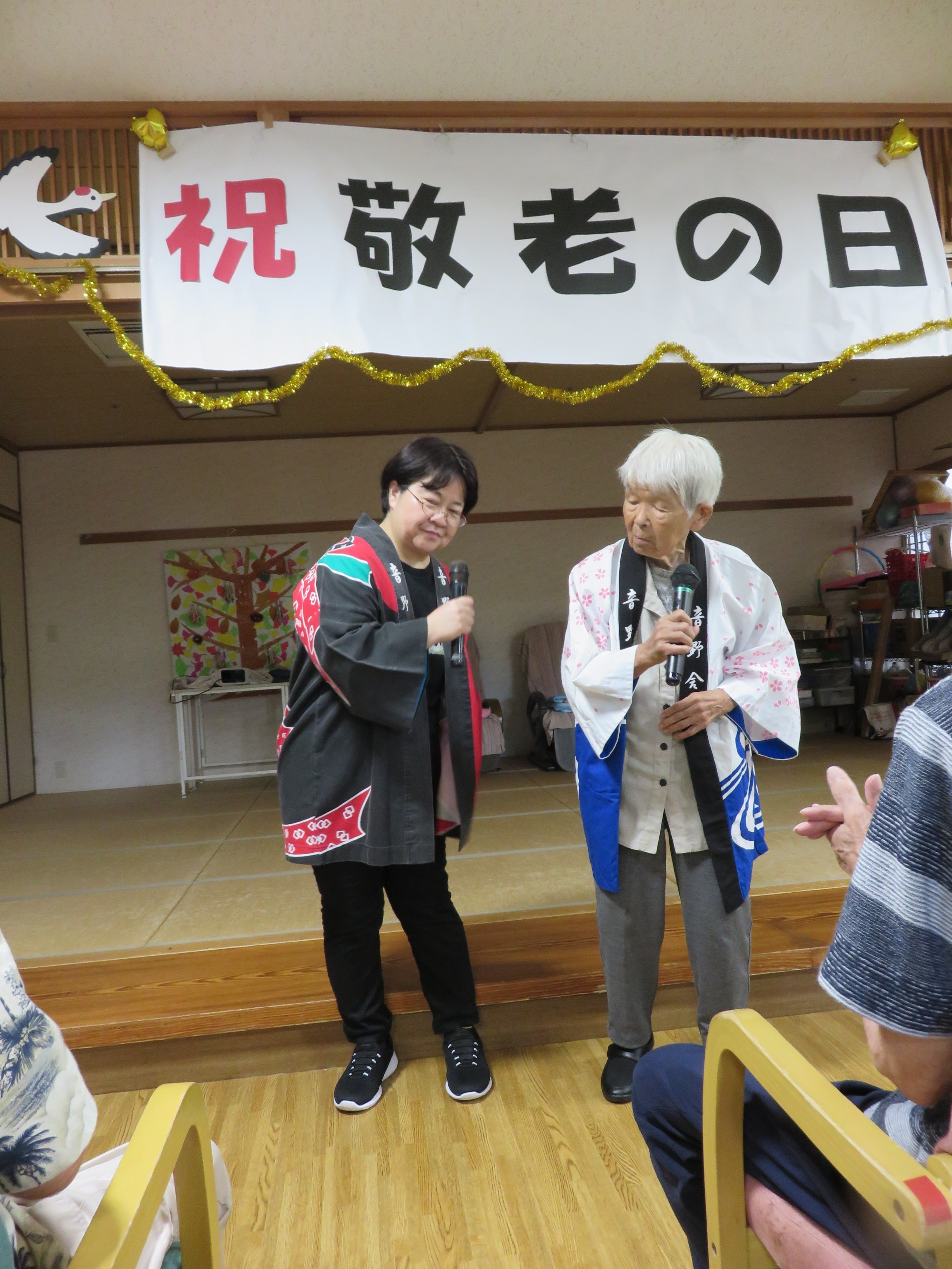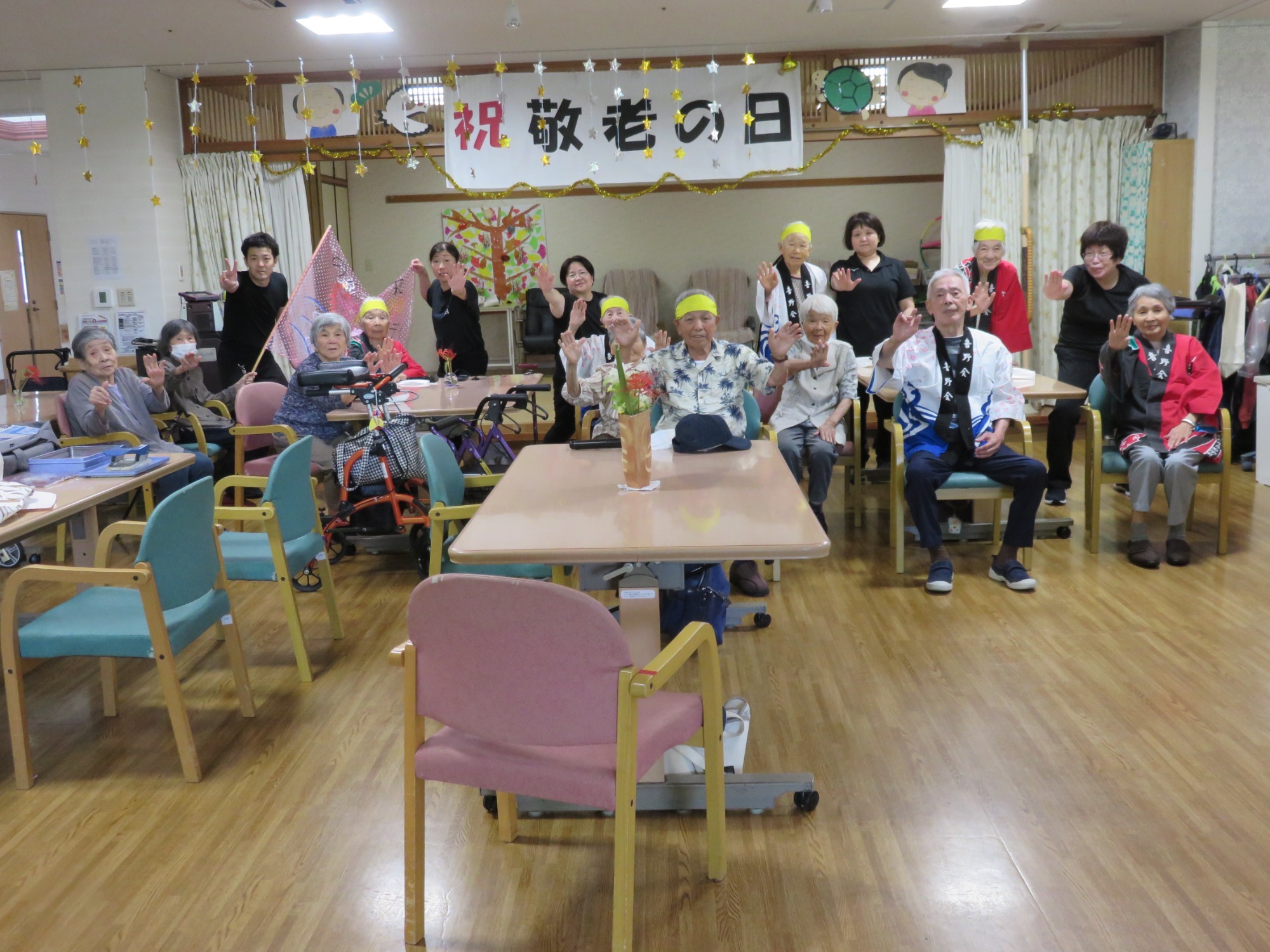 9月第3週に敬老会を行いました。 職員の余興や利用者様の飛び入り余興などもあり大笑いでした。利用者様のカラオケや踊りのうまさに大きな拍手!!役者に紙吹雪を投げて久し振りに黄色い歓声をあげていたようです。また利用者様の堂々たる姿に次回の敬老会余興の予約をお願いしました。快く引き受けてくださった方々に感謝しかありません。ありがとうございました😘💕みんなで記念撮影し、とてもいい表情です👍ささやかですが、職員で作ったプレゼントをお渡ししましたが喜んでいただけましたでしょうか?最後に、利用者様みなさま、これからもお元気でお過ごしください。(職員一同)