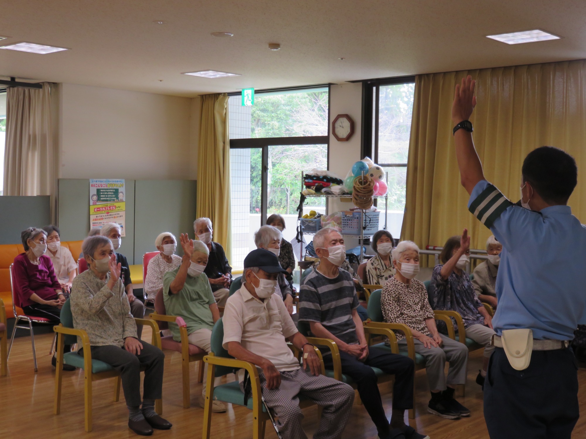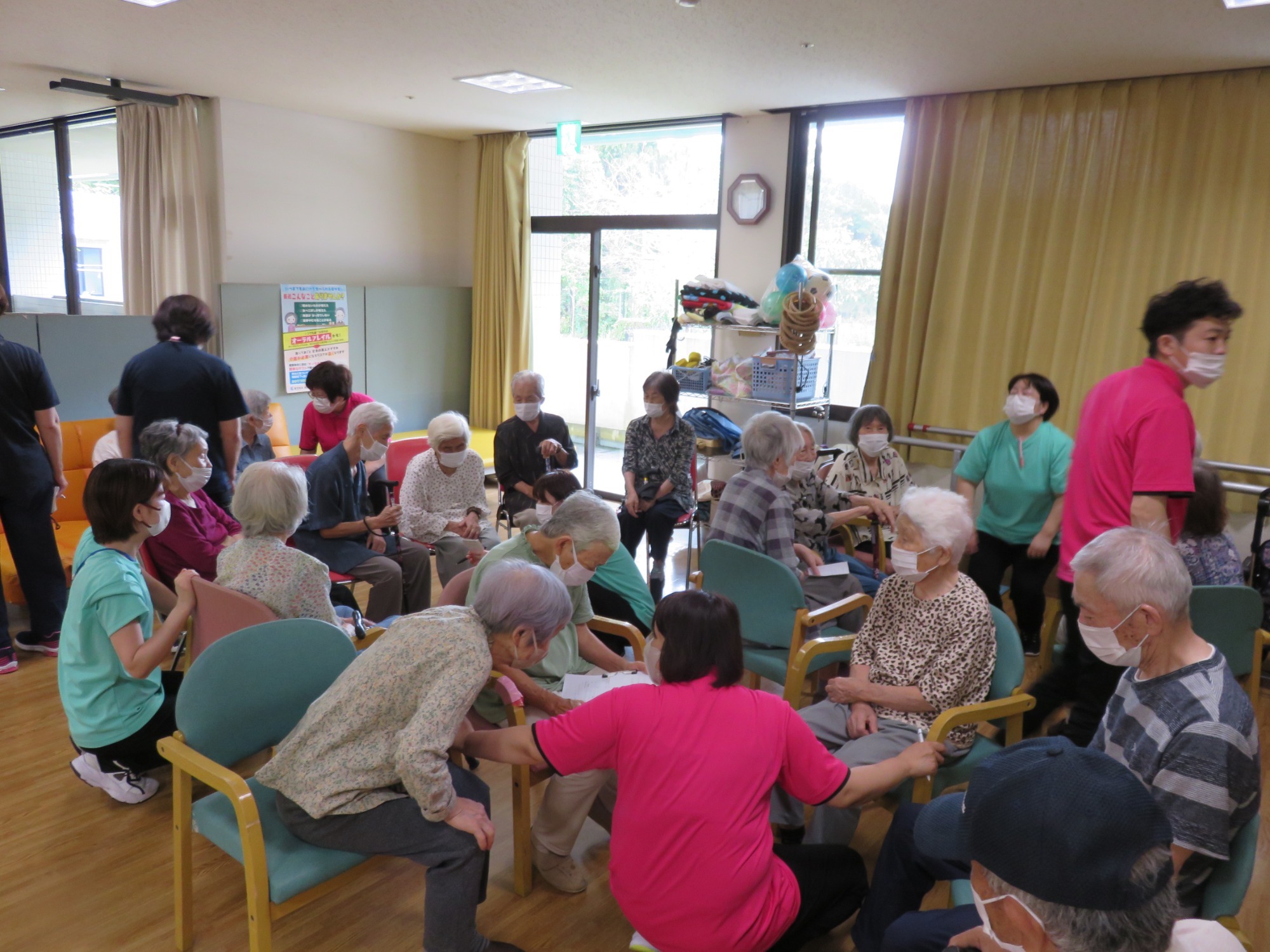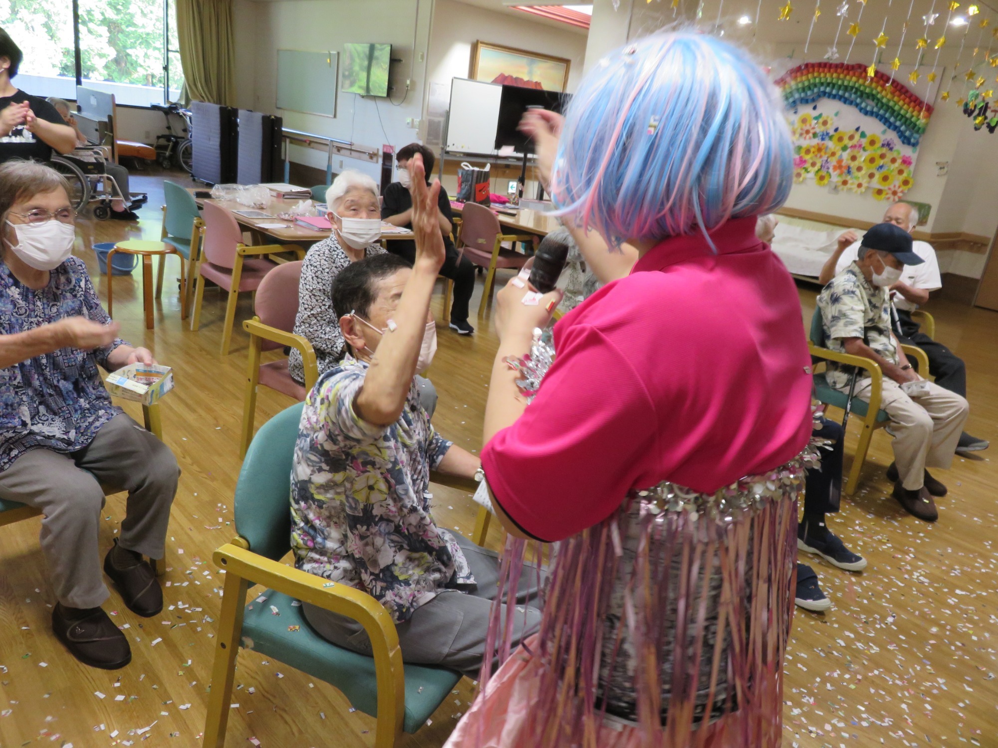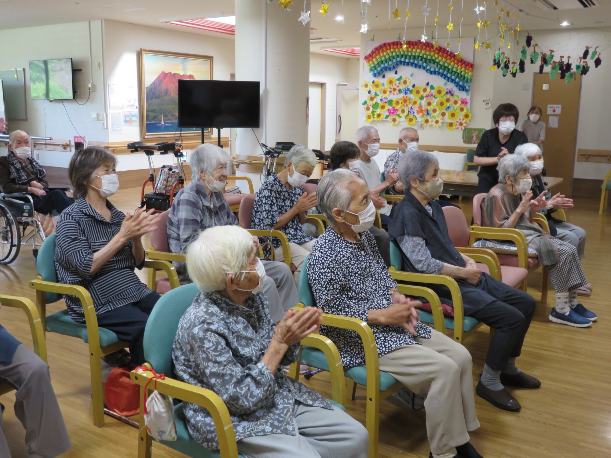 9月第3週に敬老会を行いました。 職員の余興や利用者様の飛び入り余興などもあり大笑いでした。利用者様のカラオケや踊りのうまさに大きな拍手!!役者に紙吹雪を投げて久し振りに黄色い歓声をあげていたようです。また利用者様の堂々たる姿に次回の敬老会余興の予約をお願いしました。快く引き受けてくださった方々に感謝しかありません。ありがとうございました😘💕みんなで記念撮影し、とてもいい表情です👍ささやかですが、職員で作ったプレゼントをお渡ししましたが喜んでいただけましたでしょうか?最後に、利用者様みなさま、これからもお元気でお過ごしください。(職員一同)