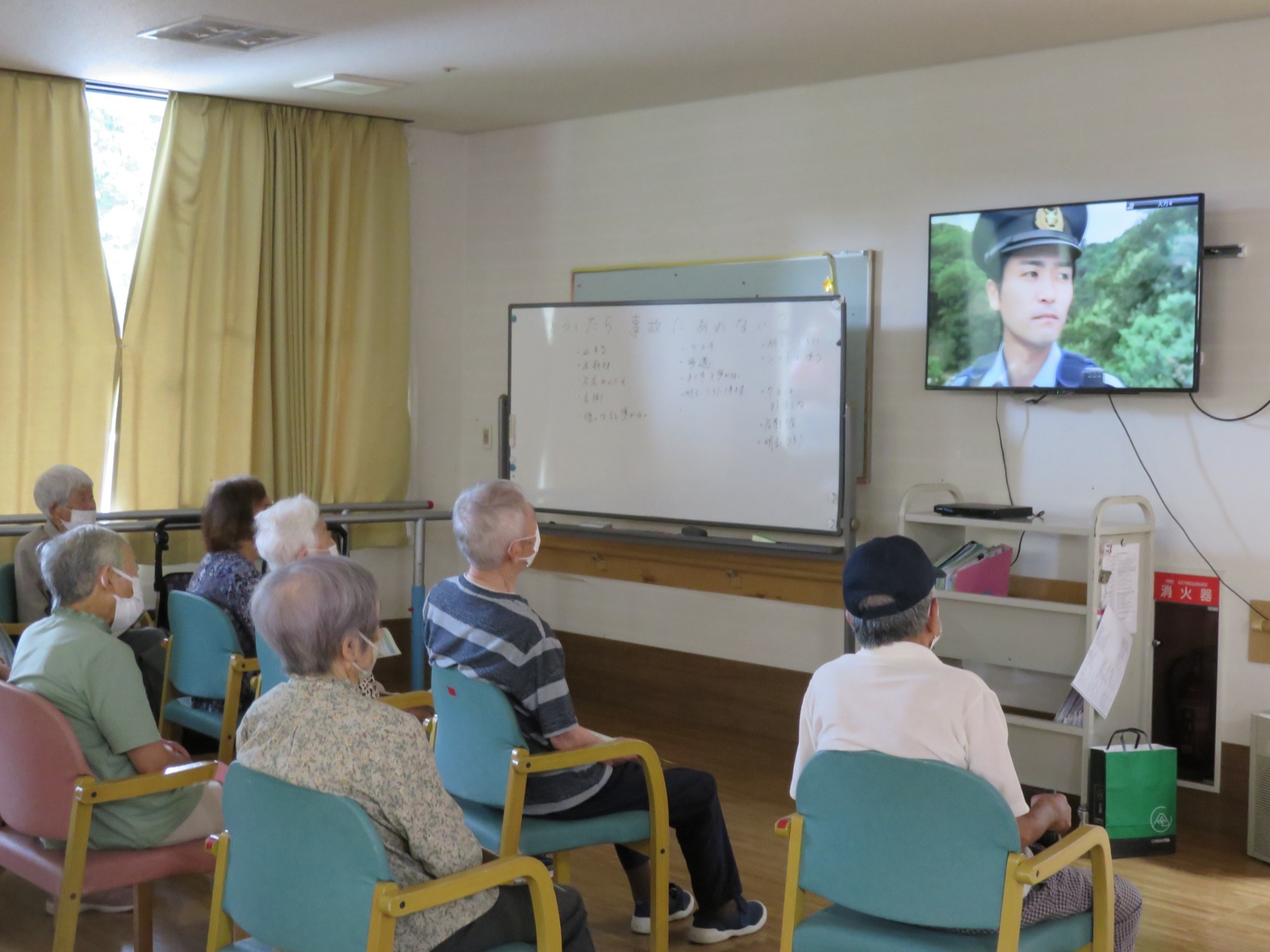 9月24日(水)に南九州警察署の交通安全課の方を講師に招いて、交通安全についての講話とDVD鑑賞を実施しました。日常生活において、交通事故防止のためにはどうすれば良いか?の議題をもとにグループワークを行いました。皆さん、真剣な表情で意見交換を行い問題点を発表してくださいました。DVD鑑賞では、眠くなりそうになりながらも、一生懸命に目を開けてみている姿もありました。また、質問では交差点で横断歩行を横断中に車が止まらない事に不安を言われ、高齢になると歩行速度も遅くなるのでどうしたらよいですか?と悩んでいるようでした。歩行者が優先ですので、車が停車しないといけない旨を伝えてくださり、納得はされたようです。この意見をふまえ、運転者はより一層、歩行者に注意を払い運転しなければならないなと改めて考えさせられました。利用者様、職員ともに勉強になり、警察官の方に感謝の意味を込めて盛大な拍手を送りました。次回もまた計画していきたいと思うところです。