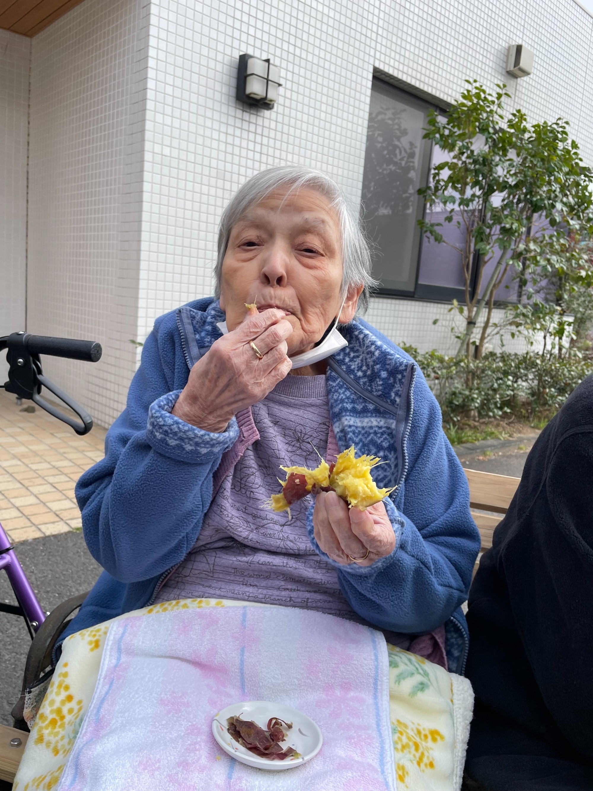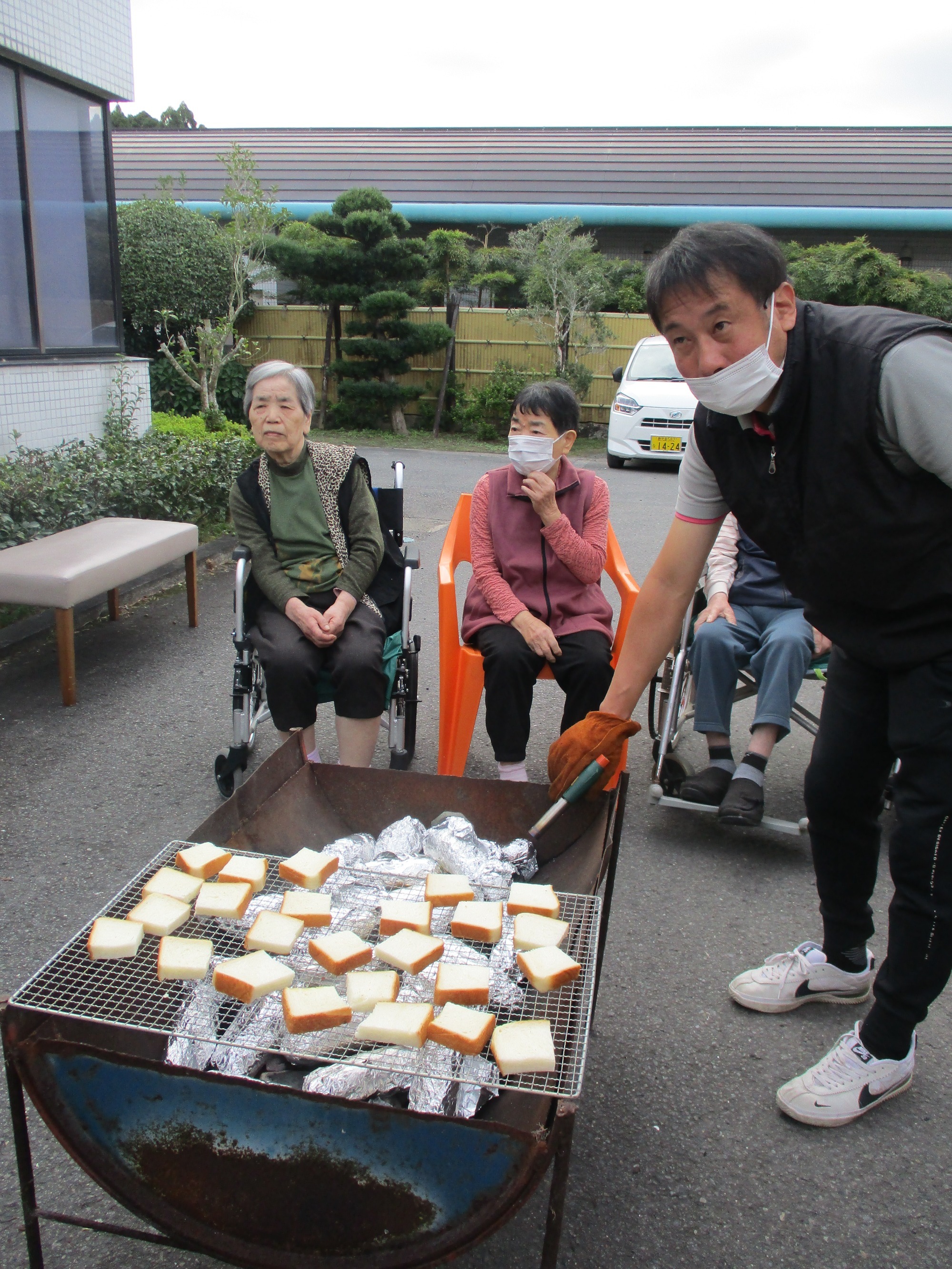 先月掘った芋で焼き芋をしました。芋を濡れた新聞紙に包むのも、アルミ箔に包むのも早い早い。楽しそうに作業をされていました。芋に火が通るまでの繋ぎで食パンも焼きました。マーガリンとジャムを塗ったパンも、ホクホク・ねっとりの芋も美味しかったでした。この日は2か月に1回の地域の方やご家族、行政の方をお呼びしての「地域密着型運営推進会議」の開催日。グループホームの活動を知って頂き、また交流を持っていただき良かったです。