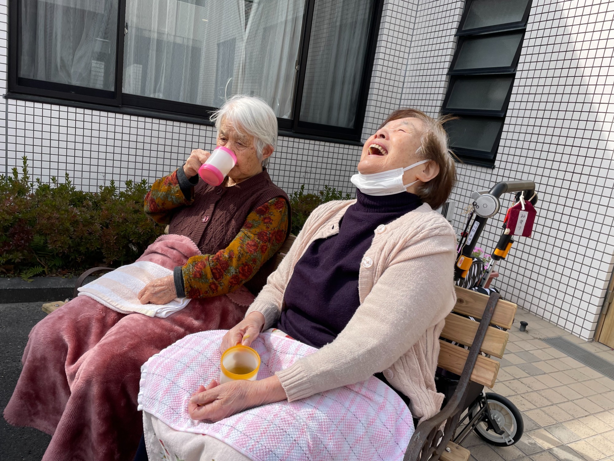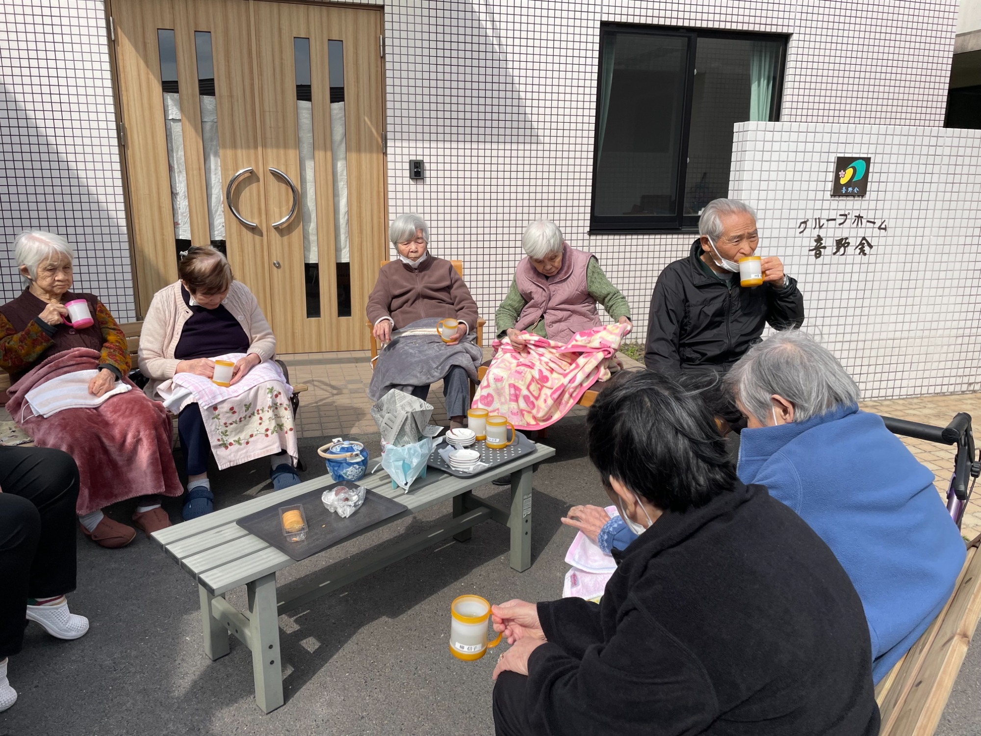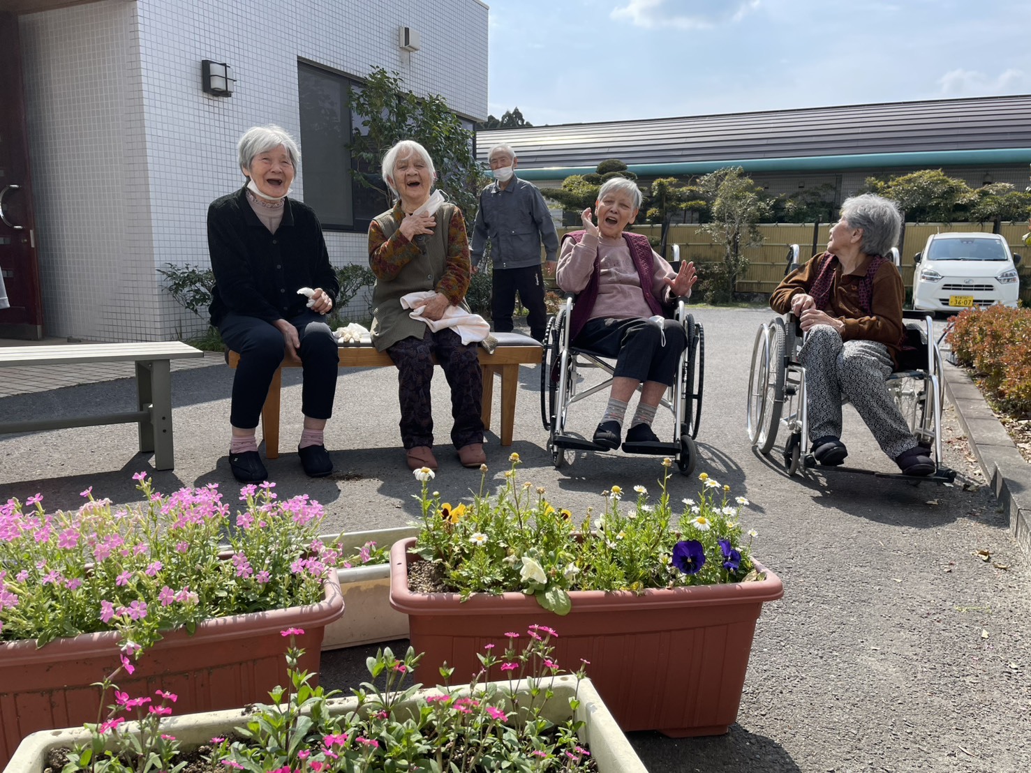 ぽかぽか日和。玄関先でお花を植えたりお茶を飲んだり。利用者様曰く「園遊会」だそうな。桜の頃は「桜を見る会」を開催しましょうね(^^♪